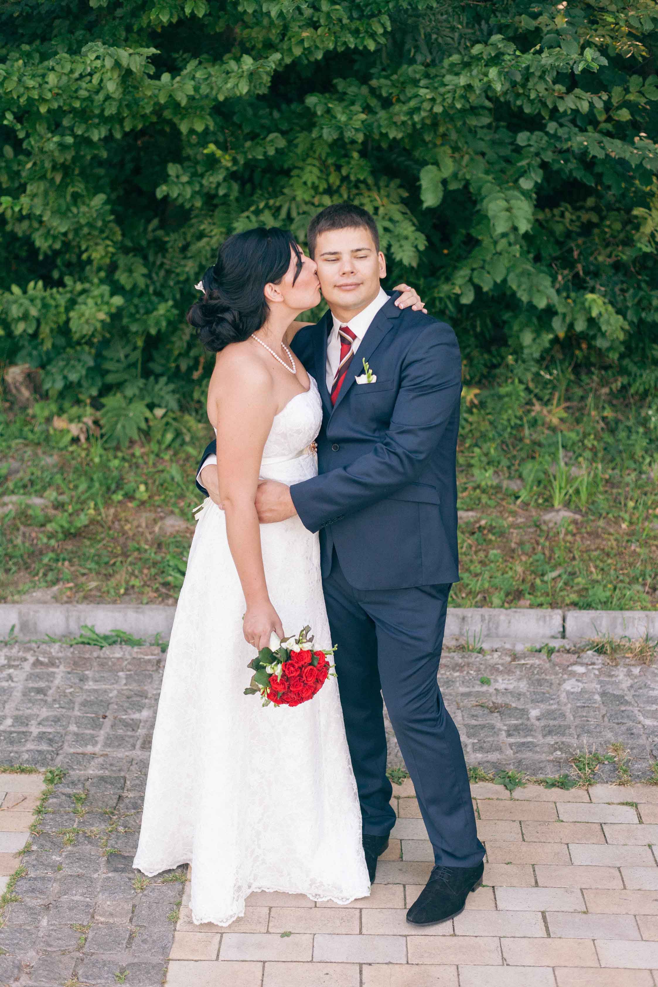 Жена целует своего мужа на фоне зелени